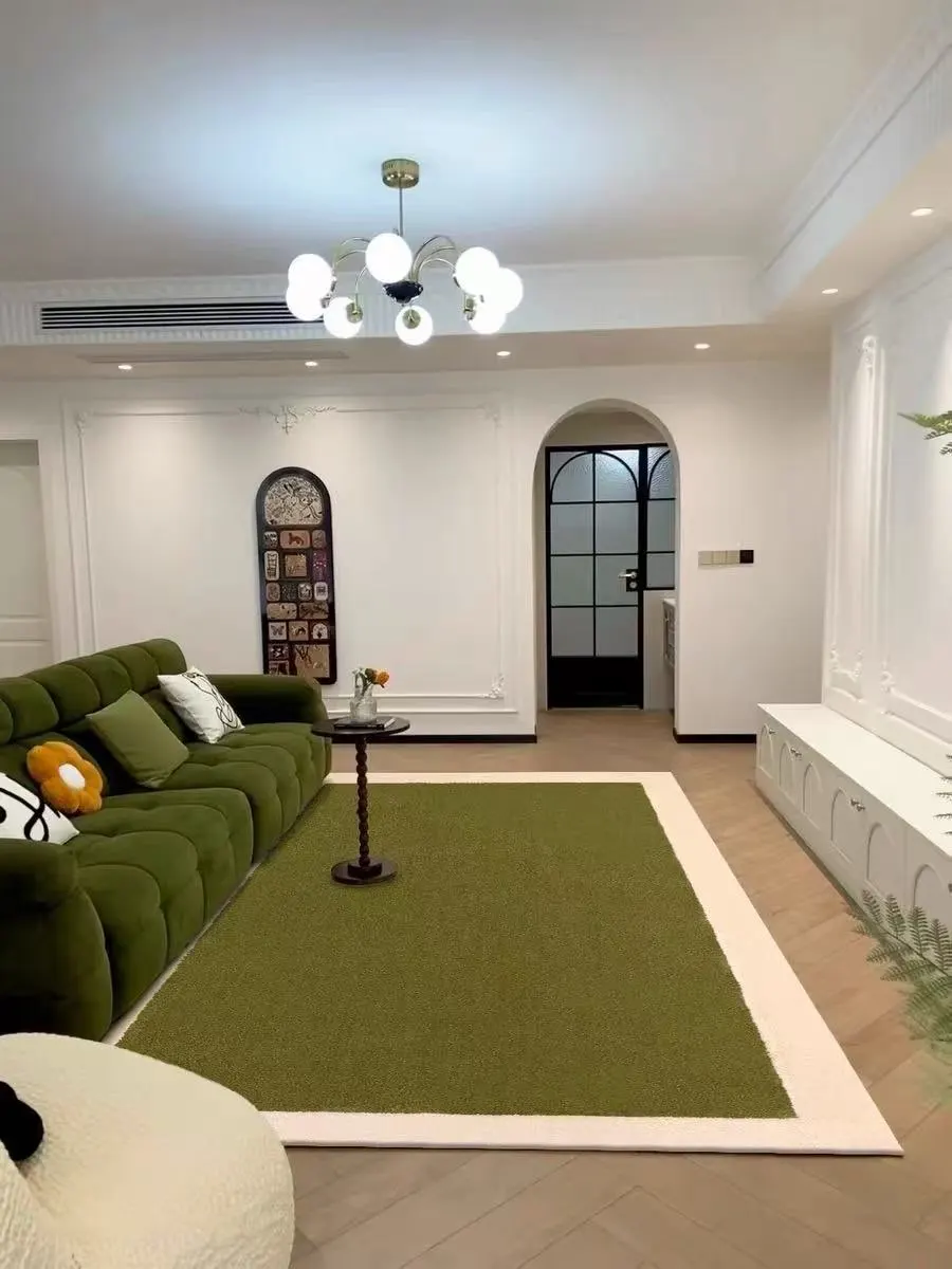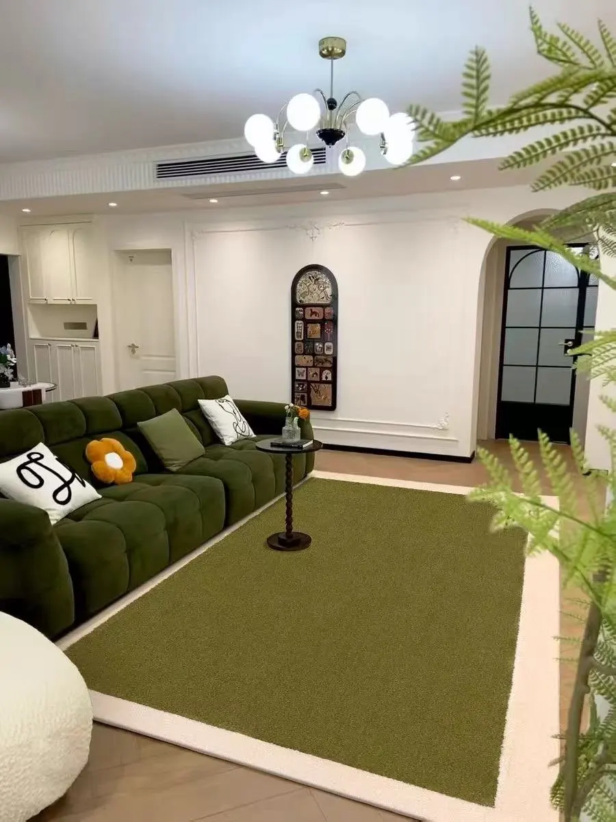 Moderner Wohnteppich in Grün mit hellem Rahmen